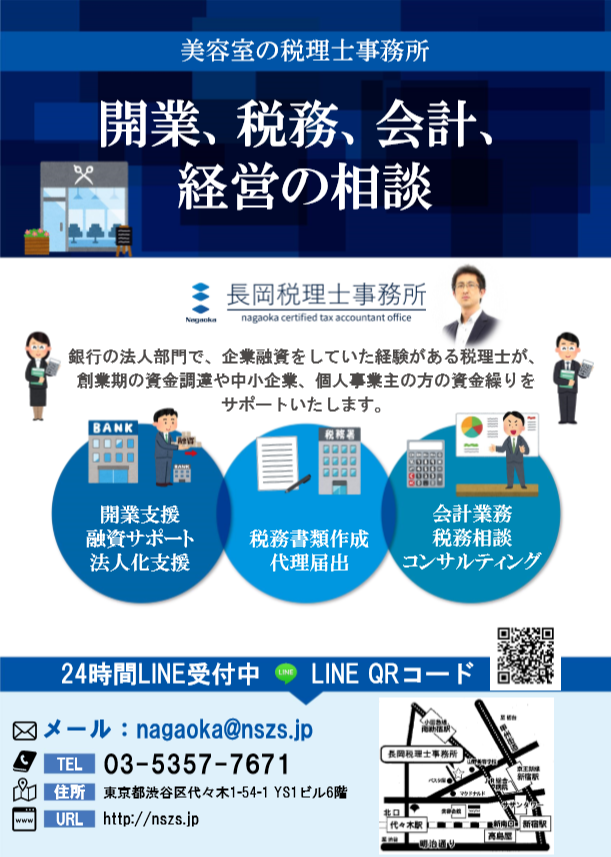 美容師の独立、美容室開業サポートのご案内(2) 美容師の独立、美容室の開業支援・サポート情報 【美容室の税理士事務所が美容室を開業する際のワンポイントアドバイス】 開業、税務、会計、経営のご相談など 銀行出身でサロン専門税理士事務所の長岡税理士! 「長岡税理士」 銀行の法人部門で、企業融資をしていた経験がある税理士が、創業期の資金調達や中小企業、個人事業主の方の資金繰りをサポートいたします。 くわしくはLINE、メール、お問い合わせフォームからお気軽にお問い合わせください